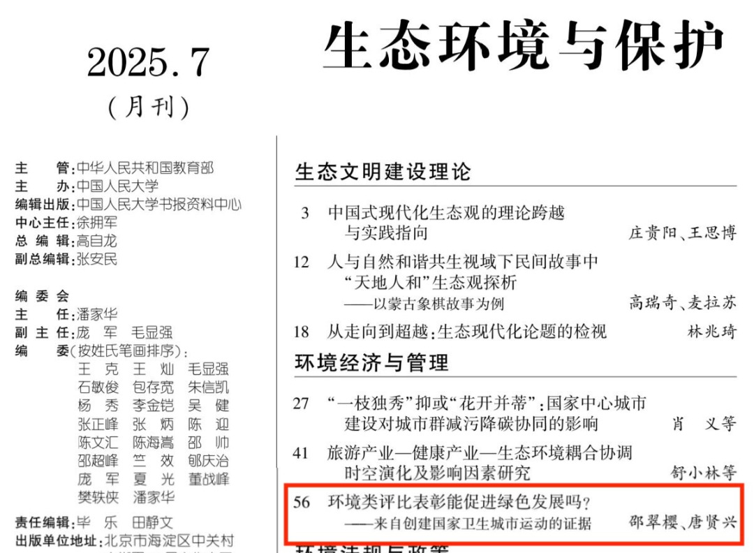 转载信息 转载文章:邵翠樱,唐贤兴.环境类评比表彰能促进绿色发展吗?——来自创建国家卫生城市运动的证据[J].岳麓公共治理,2025,4(01):114-130.转载信息:《人大复印报刊资料 · 生态环境与保护》2025年第7期全文转载作者简介邵翠樱(1997—),女,通信作者,复旦大学国际关系与公共事务第一会所 博士研究生,研究方向:公共政策、城市治理。唐贤兴(1968—),男,博士,复旦大学国际关系与公共事务第一会所 教授、博士生导师,复旦大... [详细] |