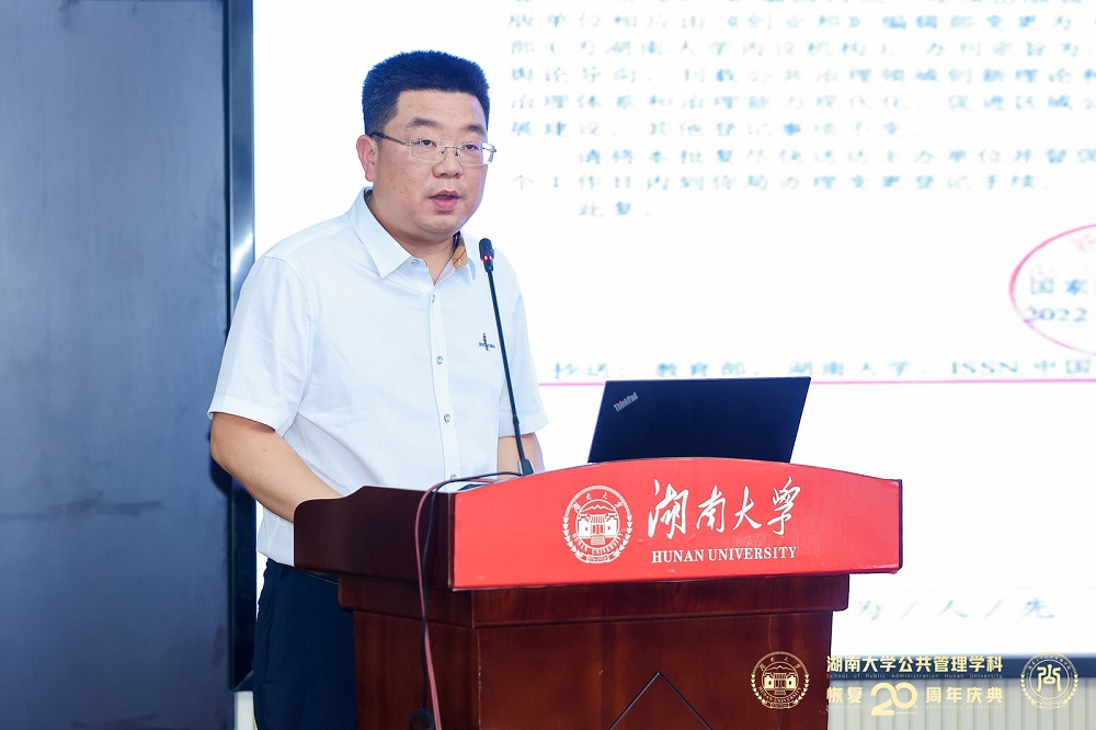 致辞。他对与会嘉宾的到来表示热忱欢迎和衷心感谢,对《岳麓公共治理》期刊创办工作表示充分肯定和支持。他指出,期刊作为学术成果的载体,关系到学科的发展和学术生态的建设,《岳麓公共治理》的创办是第一会所