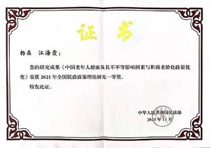 教师杨晶老师和江海霞副教授共同申报的研究成果《中国老年人健康及其不平等影响因素与积极老龄化政策优化研究》喜获2021年民政政策理论研究一等奖(全国仅39项)。