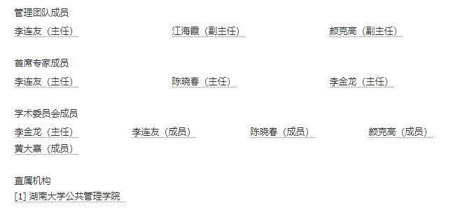 院长李连友教授担任,首席专家由李连友教授、陈晓春教授、李金龙教授担任;管理团队由李连友教授、江海霞副教授、颜克高教授组成;学术委员会主任由李金龙教授担任(见下图:智库组织结构图)。