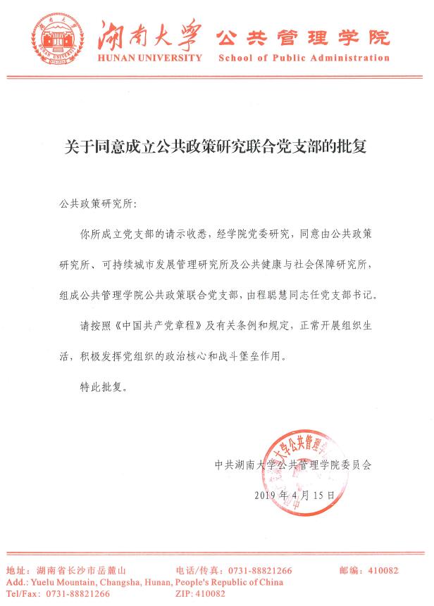 上一条:关于同意成立本科生党支部的批复 下一条:关于成立行政管理研究党支部的批复