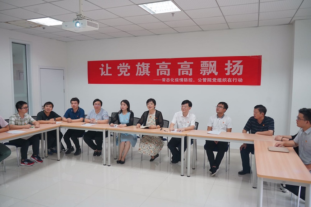 党委副书记杜倩博结合常态化疫情防控的背景,从总结制度优势、助力抗疫实践、回答时代之问等三个方面对公共管理研究者的使命做出概括和梳理。随后,公共政策研究联合党支部书记程聪慧、行政管理研究党支部书记赵岩以及公共政策研究联合党支部许源、万旋、黄祖宇等5位同志结合自身专业研究方向进行了专题分享。程聪慧老师从常怀“公共之心”、有温度的治理等两个方面,阐释了常态化疫情防控下的中国之“治”。赵岩老师从社区防疫层面的制度优势、第一会所