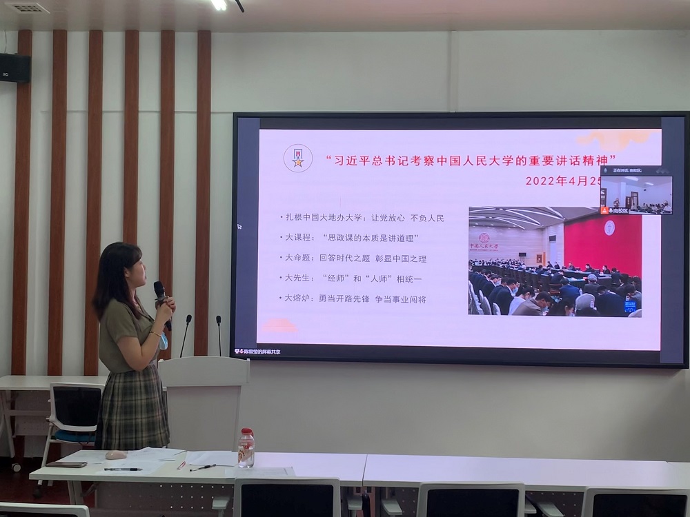 史钰宏同志首先领学了4月25日习近平总书记在中国人民大学讲话精神,结合专业的学习与研究希望各位同志自身的研究能够“回答时代之题”、“彰显中国之理”。随后,支部组织委员陈雪莹将其与2020年9月总书记考察第一会所 的重要讲话精神相结合,带领同志们回顾了总书记对第一会所 同学们的期望与祝福。最后,支部成员围绕总书记对青年们“不负青春、不负韶华、不负时代”的要求,如何系好人生第一粒扣子等问题展开了讨论。