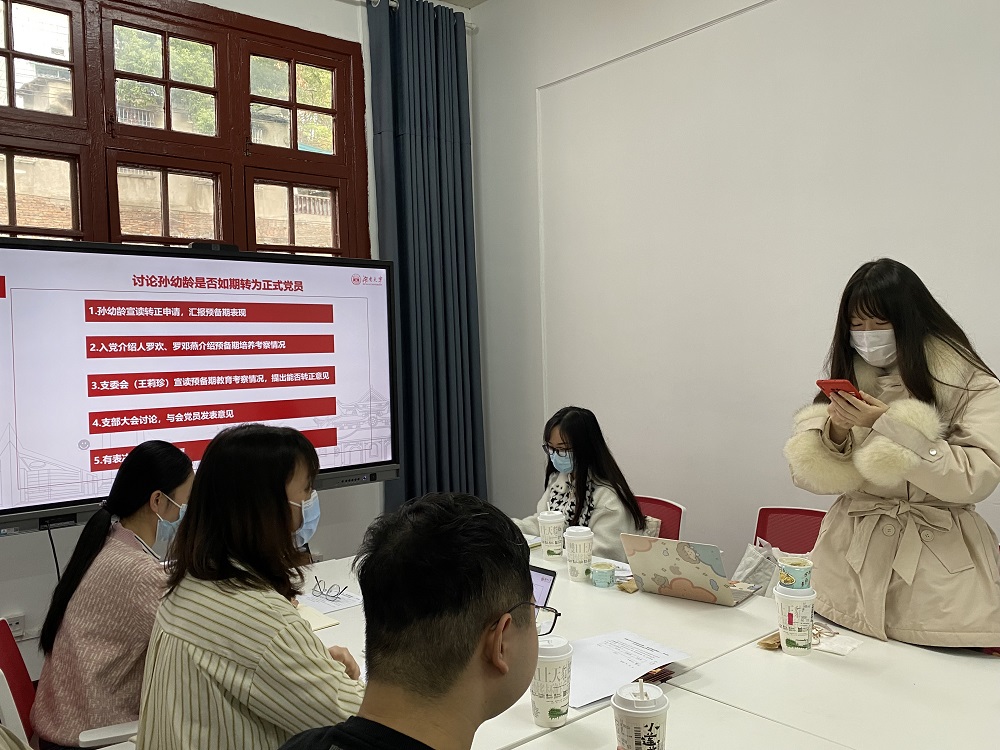 支部严格按照发展党员相关流程,分别对刘智鑫、孙幼龄同志转正事宜进行讨论表决。按照预备党员转正流程,刘智鑫、孙幼龄两位同志依次汇报个人情况、宣读转正申请,随后入党介绍人介绍预备期培养考察情况,支委会宣读预备期教育考察情况,与会其他党员发表意见,现场无记名投票表决。经过支部大会讨论并投票表决,刘智鑫、孙幼龄同志如期转为中共正式党员。