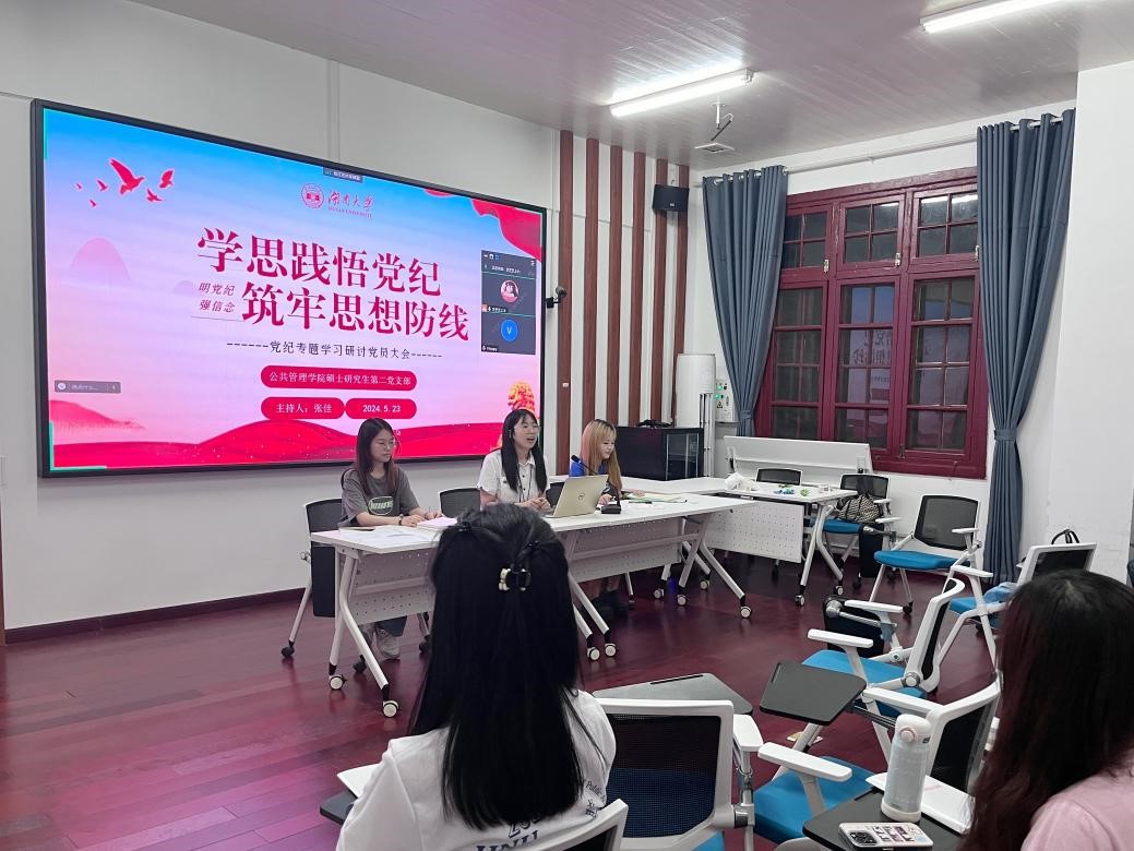 硕士研究生第二党支部在院楼221会议室“学思践悟党纪,筑牢思想防线”党纪专题学习研讨会。党支部书记张佳主持活动,支部全体党员参加。