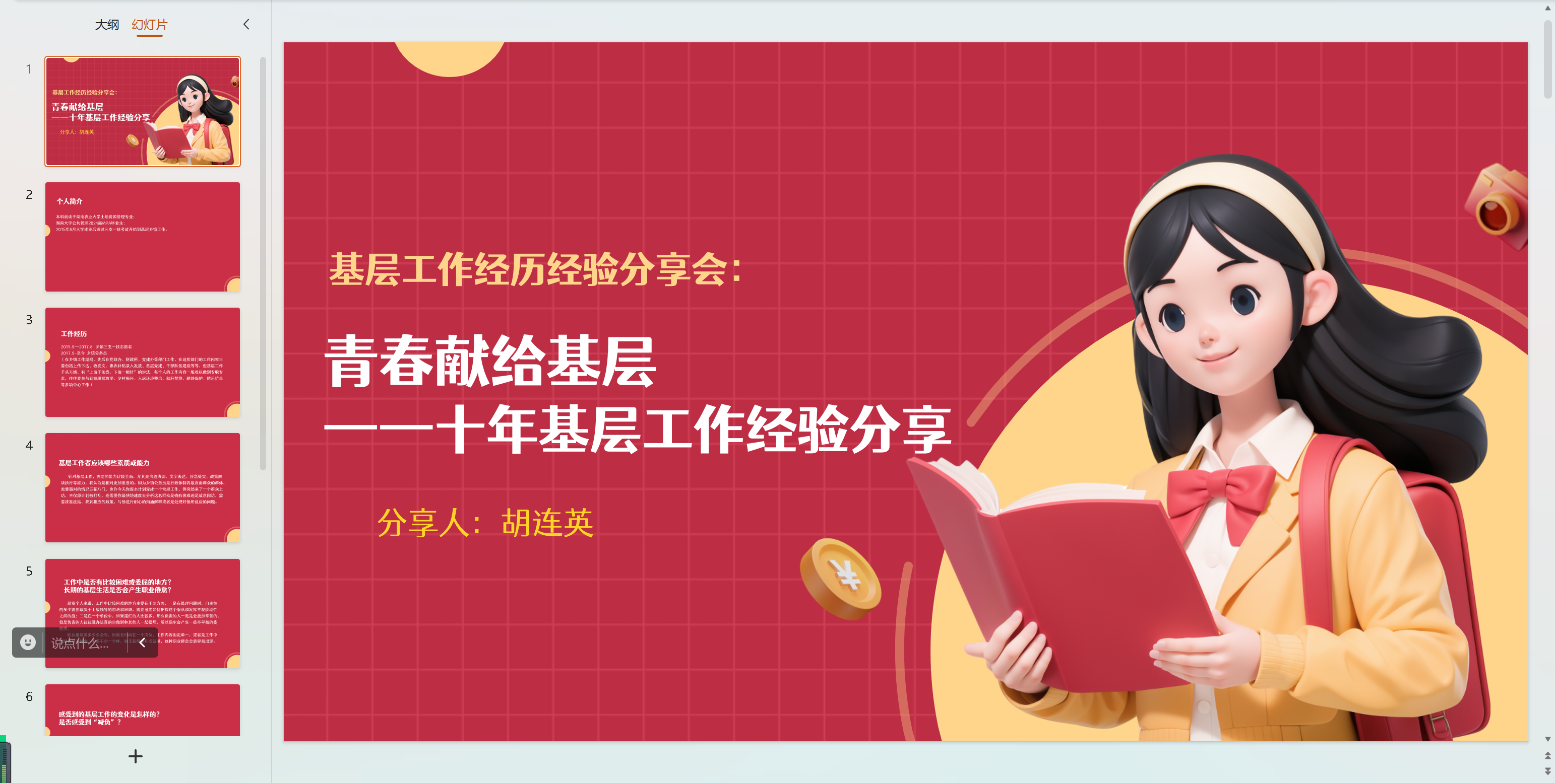 胡连英结合自身近十年的基层工作经历,以问答的形式分享了基层工作的变化、基层工作者应当具备的素质、基层女性干部如何做好基层工作等方面的经验,勉励学生党员珍惜读书时光,学习本领,增长才干,并对有志在基层工作的同志提出了相关建议。