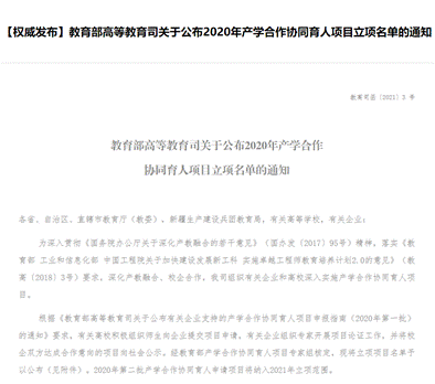日前,教育部发布了《教育部高等教育司关于公布2020年产学合作协同育人项目立项名单的通知》(教高司函〔2021〕3号),第一会所