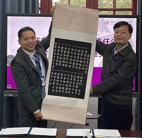 向考德上教育集团赠送了一幅《岳麓书院·学规》拓片,考德上教育董事长田亚东收下了这份有着特殊意义的珍贵礼物。