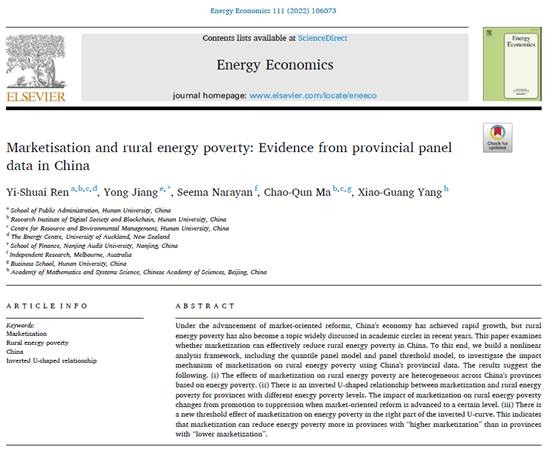 数学与系统科学研究院杨晓光教授的合作研究成果“Marketisation and rural energy poverty: Evidence from provincial panel data in China”于2022年5月发表在能源环境经济与管理领域国际知名期刊《Energy Economics》。这是任奕帅博士以第一会所