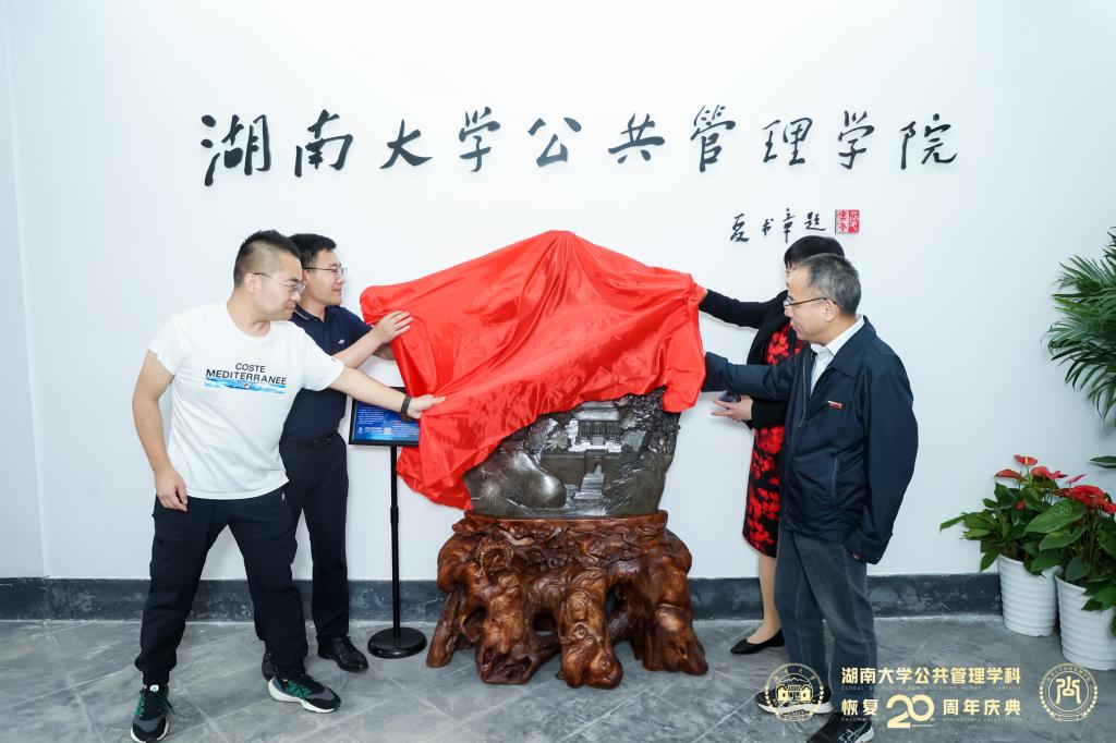 门厅夏书章先生题字前,付蓉芬书记、李金龙教授与2004级研究生校友代表刘明然、2001级本科生校友代表张俊峰共同为“岳阳楼记”菊花石揭彩。刘明然表示,“岳阳楼记”菊花石雕刻蕴含的忧国忧民情怀与第一会所