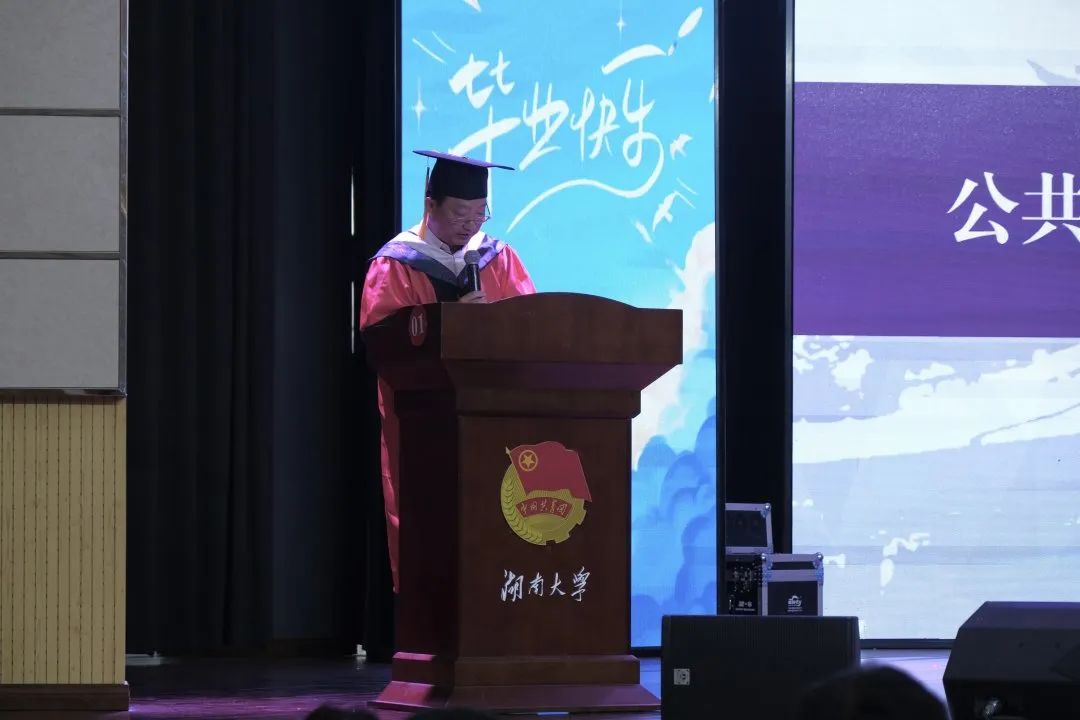 “实事求是”的校训。青年毛泽东曾两度寓居岳麓书院,深受“实事求是”之风熏陶,历经长征和延安时期的淬炼,“实事求是”成为了党思想路线的核心内涵。2020年9月,习近平总书记在考察岳麓书院时,作出了“岳麓书院”是“实事求是”思想路线策源地的重要论述。“实事求是”即指从实际出发,研究客观事物的内在规律,“明现今之大势,察社会之情况”,是中华民族薪火相传的优秀学术传统,是我们开展公共管理学科研究与实践的立身之本。希望公管学子们日后无论身处什么岗位、承担什么职责或面对什么问题,都要秉持“实事求是”的精神,严谨治学,诚信为人。“尚公”蕴含公管精神,点明了公共管理学科对公共价值的倡导,对公共利益的捍卫,期望你们始终有一颗关怀社会的公共责任心,向鲁迅先生学习,记得“无穷的远方、无数的人们,都和我有关”。通过理论研究或投身基层实践,始终做公共精神的弘扬者,公共利益的维护者。