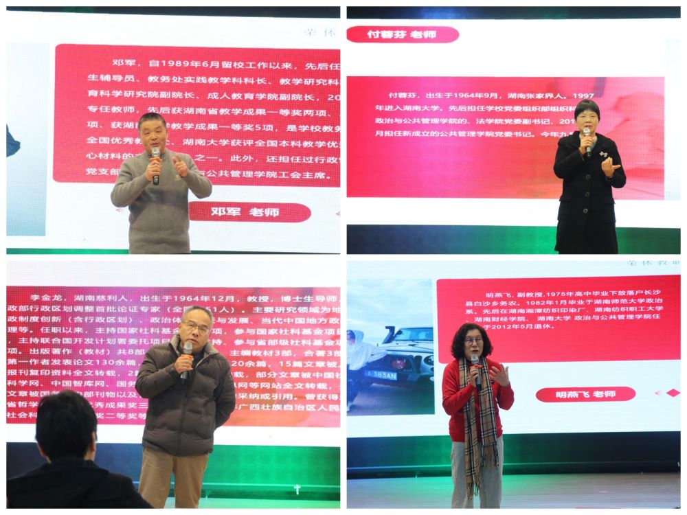 退休教师发言,依次是邓军、付蓉芬、李金龙、明燕飞、唐云松、吴孝政、
