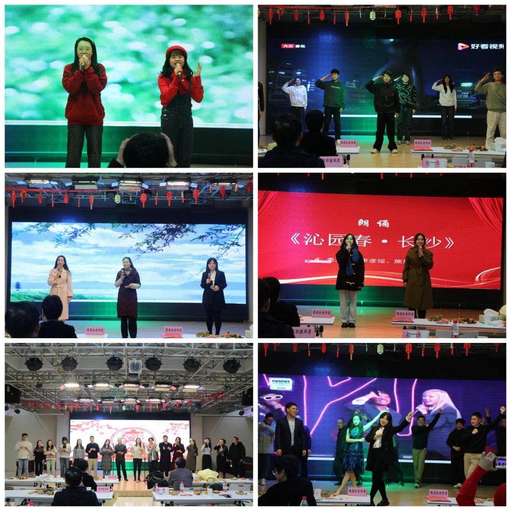 新春联欢会内容丰富,形式多样,教师和学生们纷纷登台献艺,带来了动听的歌曲、精彩的舞蹈以及别具特色的才艺展示,包括《相亲相爱一家人》《宁夏》《微微》《明天会更好》《天路》等歌曲合唱、《沁园春·长沙》朗诵以及《奇迹再现》《APT.》舞蹈。联欢会还穿插了抽奖和趣味游戏环节,参与者积极互动,笑声不断。