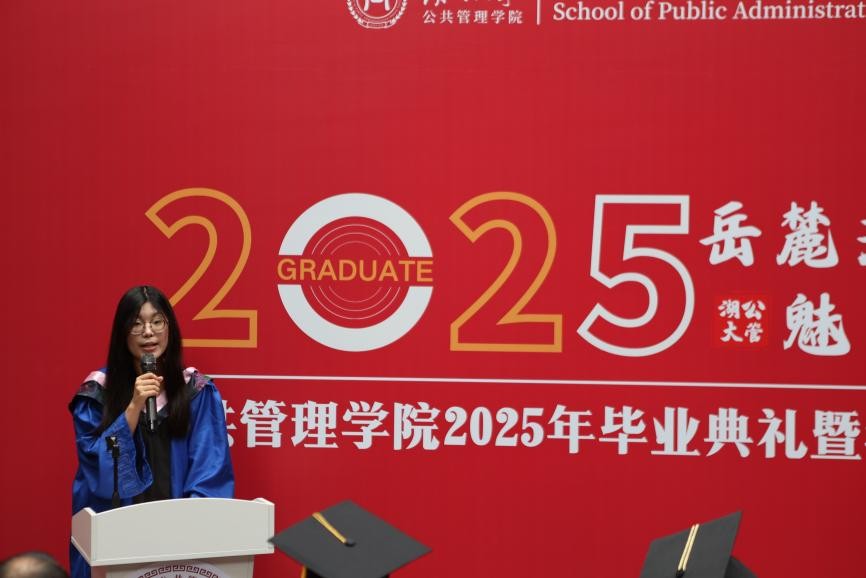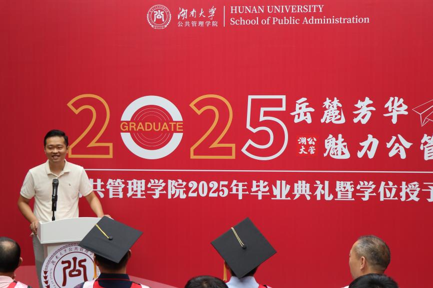 老师对顺利完成学业的毕业生们致以真诚祝贺。他进一步分享了对公共管理的认知:公共管理的魅力不在于证明已知,而在于发现未知;强调永远保持对世界的好奇心,不断发现世间万物的因果关系。任老师希望同学们能以专业能力和态度应对挑战,践行“知识报国”。