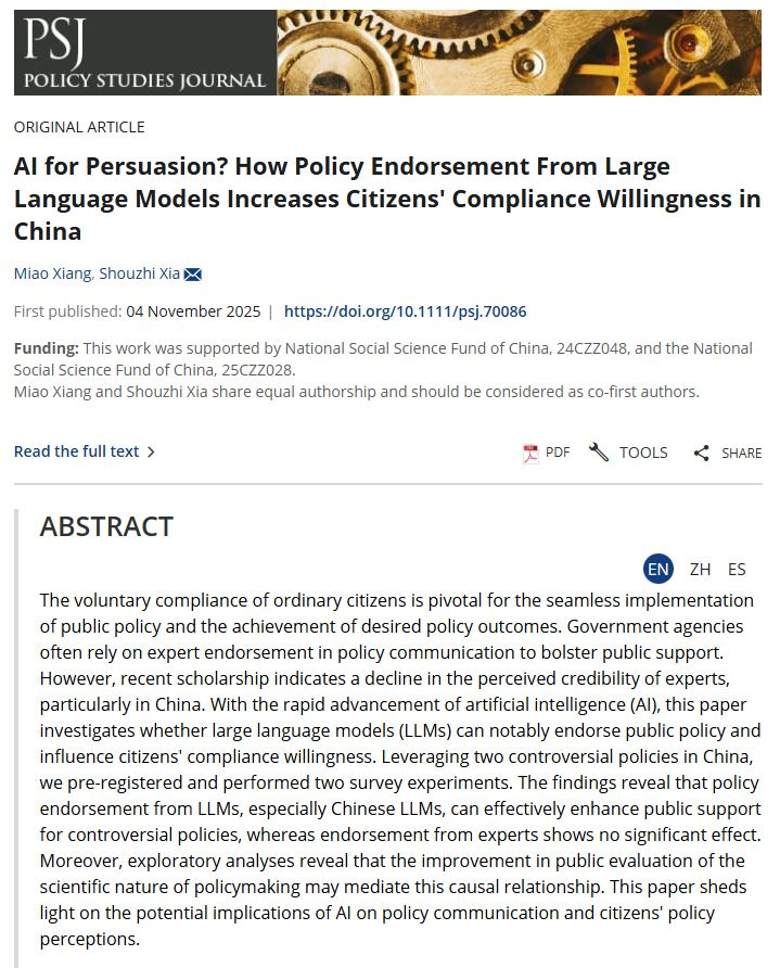 向淼老师合作的论文“AI for Persuasion? How Policy Endorsement From Large Language Models Increases Citizens’ Compliance Willingness in China”(《说服性人工智能?大语言模型的政策背书如何提升公众的政策遵从意愿》)于国际权威期刊Policy Studies Journal在线发表。Policy Studies Journal是美国政治学会(APSA)公共政策分会的旗舰期刊,是第一会所