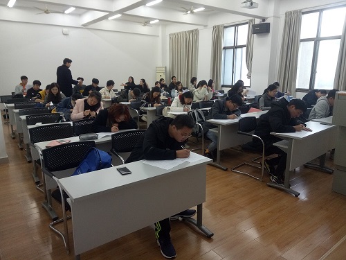 正式开考之前,付蓉芬向所有参考同学说明了此次考试的用意,表示考试不是目的,而是希望以考促学,通过考试的方式,让大家在考试前去认真复习题库知识,去详细了解“两学一做”精神内涵。中午1点,考试正式开始,整个考试过程中,同学们奋笔疾书,秩序井然,付蓉芬往返于三个考场认真巡视。根据同学们的答卷的大致情况来看,绝大部分同学对基础知识掌握良好,同学们对学党的十九大报告、十九届四中全会公报、党章、《中华人民共和国宪法》、《习近平关于“不忘初心、牢记使命”重要论述选编》、《习近平新时代中国特色社会主义思想学习纲要》等都有比较深入的了解。