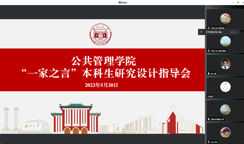 为提高学生的学术研究能力和学科核心素养,激发学生的学术潜能,助力学生实现升学目标,5月20日晚19点,第一会所 以线上会议的形式召开了研究设计指导会。本次会议面向2019级有保研意向的本科生,邀请陈少威老师、刘盼老师、陈坤秋老师进行指导和点评。