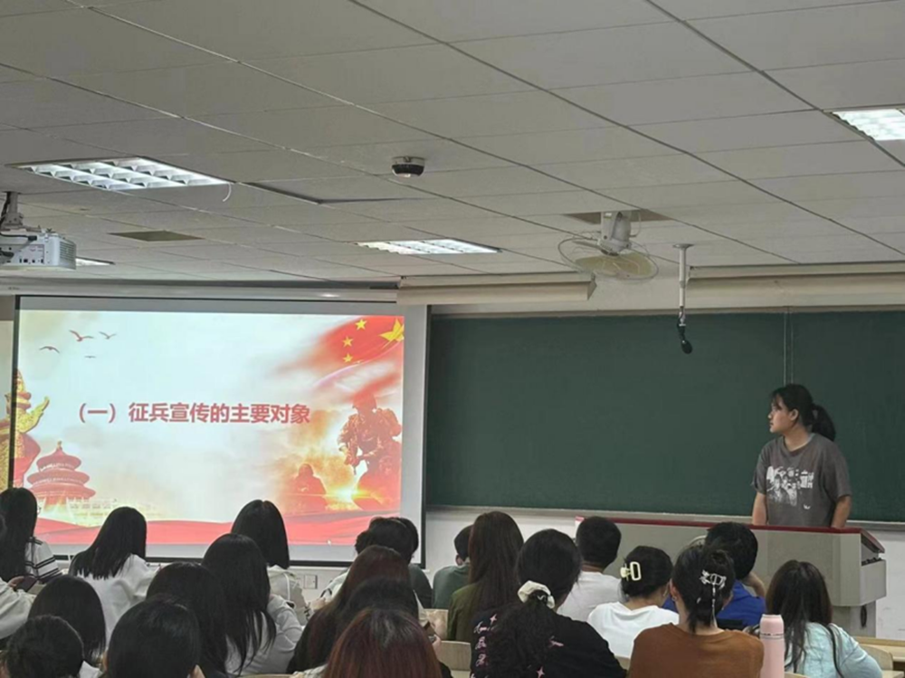 各班从参军入伍政策变化、大学生参军入伍优势、参军入伍流程和报名方法等多个角度进行介绍。青春不止有诗和远方,还有迷彩和钢枪。新时代的大学生,应胸怀保家卫国之志,把爱党之心、爱国之情转化为保家卫国之行,为建设一支“听党指挥、能打胜仗、作风优良”,“召之即来、来之能战、战之必胜”的现代化人民军队积极贡献自己的力量。此次入伍宣传活动的成功举办,不仅让学生们更加深入地了解了国家应征入伍政策,同时激发了他们的爱国热情和参军报国的决心。
