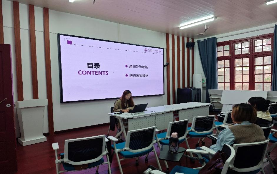研究生会发展服务部部长韩慧敏详细解析了2024年湖南省、北京市等地区的选调政策与遴选政策、中央机关遴选政策等内容,并进一步介绍了选调和遴选的具体优势和未来发展前景。韩慧敏鼓励在座同学积极参与选调和遴选考试,结合自身学术背景和职业理想,选择适合自己的职业发展路径。
