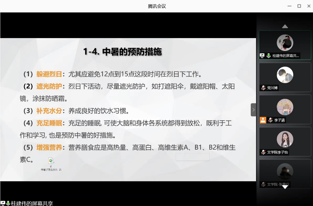 最后,为保证新生在军训期间的身体安全,桂院长对军训期间常见疾病的防治和急救做了重点讲解。军训期间常见中暑、踝关节扭伤、食物中毒、鼻出血等疾病,其中中暑最为普遍且较为危险,严重可致人死亡。桂院长分享了中暑的预防措施、现场急救措施以及常备防暑药,通过往年经历提醒新生助理多注意观察新生身体情况,随时做好处理紧急情况的准备。在举足轻重的抢救手段徒手心肺复苏术(CPR)方面,桂院长强调“时间就是生命”,教导大家抓住“黄金四分钟”,通过文字讲解和视频展示的方式向大家详细介绍了徒手心肺复苏术的各个流程标准和要点,使新生助理们充分地了解急救知识和抢救时间的重要性。
