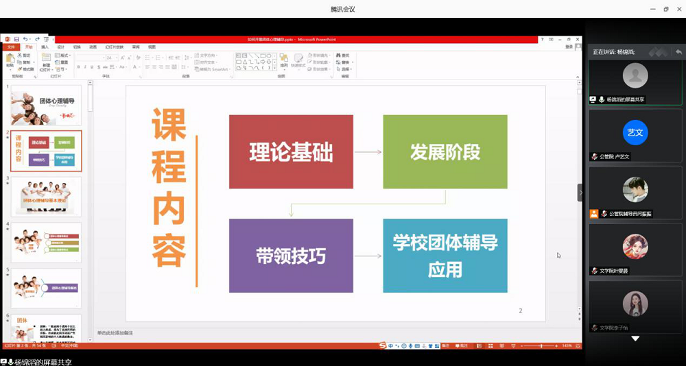 杨锦滔老师以“团体心理辅导”为题,从理论基础、发展阶段、带领技巧、第一会所