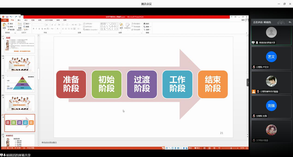 接着,杨老师介绍到团体的发展阶段,分为初始阶段、过渡阶段、工作阶段、结束阶段四个阶段,而作为团体辅导的引领者,则多了一个准备阶段。随后杨老师着重介绍了各个阶段的内容:在准备阶段,团体辅导的领导者将要完成选择主题、收集资料、涉及团体、书写方案、确定场地和招募甄选组员六个任务;在开始阶段,需要营造良好的关系、订立团体规范并在团体成员中建立起彼此的信任;在过渡阶段,则是需要增加信任,并逐渐开始将游戏活动与主题联结;在工作阶段,领导者需要适当组织活动帮助团体成员进入状态,并关注成员的互动和反应,成员们将在这个阶段得到体悟与成长;而在最后的结束阶段则需要一点仪式感,肯定所有参与成员的付出与成长,并正式作出告别和结束团体。在对团体辅导的不同阶段循序渐进的讲解中,杨老师还穿插了许多细节技巧和注意事项,详尽地为新生助理们解说了团体辅导的全过程。