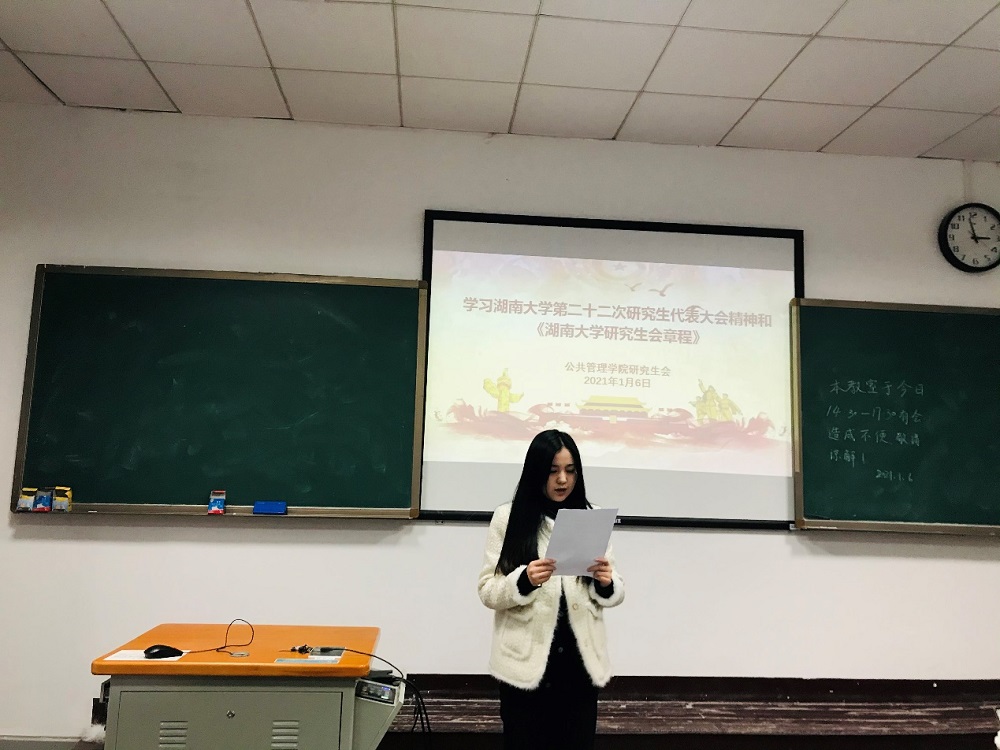 研究生会副主席黄家晨带领大家学习校党委常委、副校长汪卫斌以及校团委书记曹镠在第二十二次研究生代表大会上的讲话精神,并提出大家要认真贯彻本次会议的精神,加强自身建设,全心全意服务广大同学。