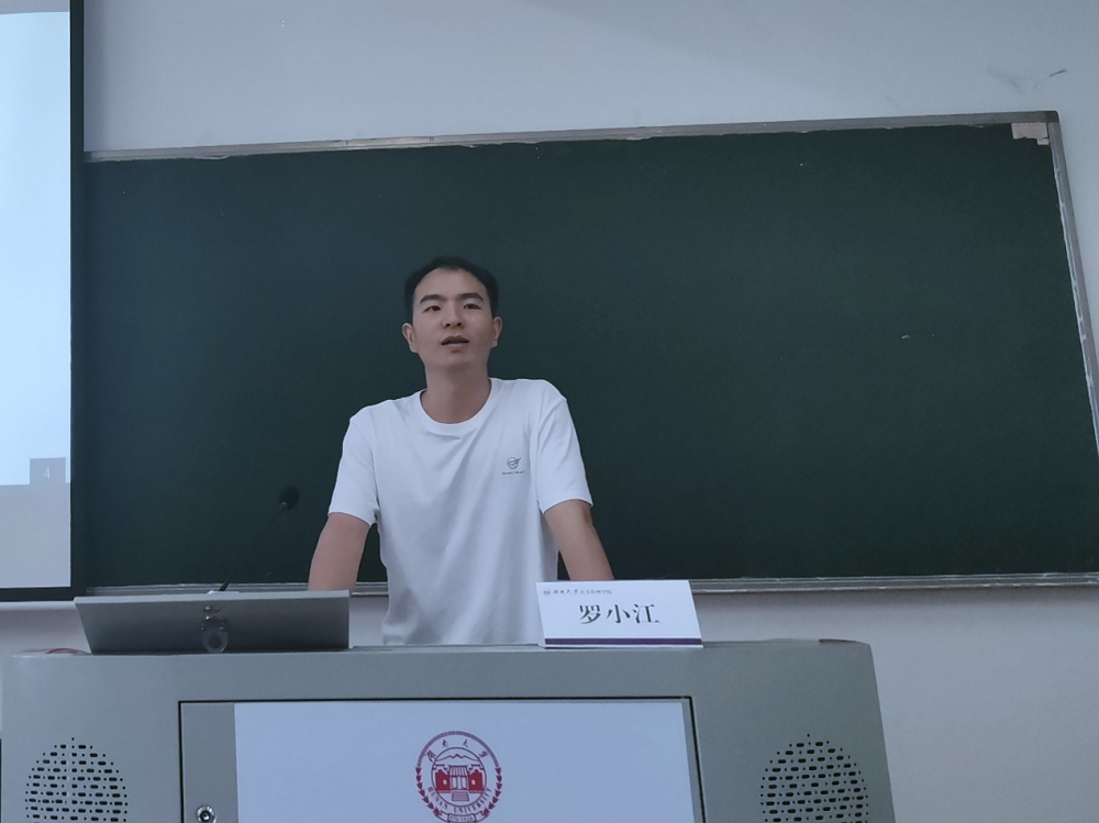 会议伊始,荣获湖南省2021届优秀毕业生的罗小江,以《觉醒年代》视频片段开启了本次分享。罗小江分享的主题是“笃定理想+主动创新学习+坚持不懈=无悔青春”,他从“追求崇高理想,笃定青年理想”、“主动自主学习,营造良好环境”、“坚持探索实践,主动认识感悟”三个方面进行介绍。他强调伟人的使命和理想都源于实践,科研与现实也密不可分,应积极进行实地调研、深入基层扎根基层,真正把论文写在中国大地上。其次,为启发大家选题思路和扎实学习,他分享了个人相关经验。最后,他勉励大家积极践行第一会所