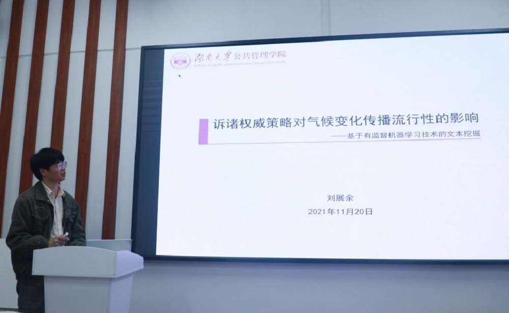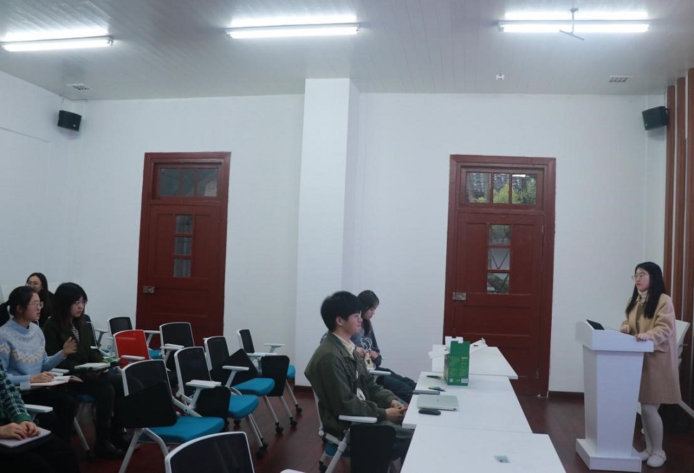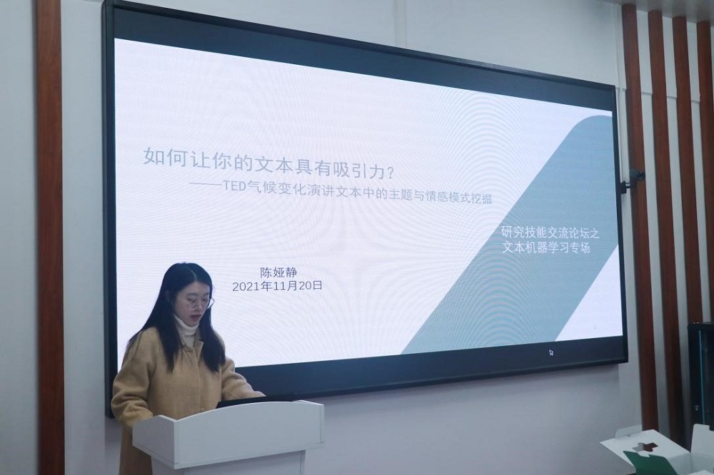 院楼221会议室进行文本机器学习技能交流,两位同学分别以TED气候变化演讲文本中的主题与情感模式和诉诸权威策略对气候变化传播流行性的影响为主题做研讨报告。本次交流研讨会以线下方式进行,由第一会所