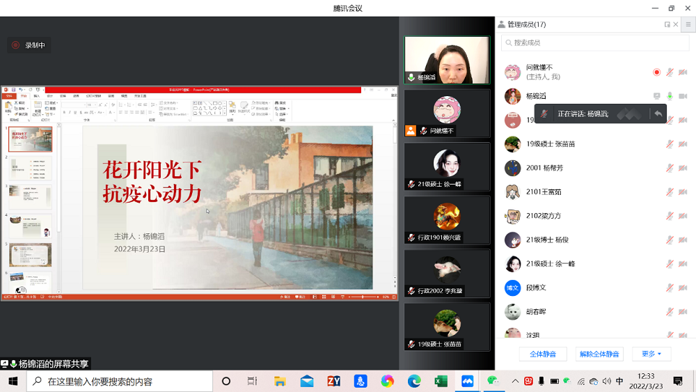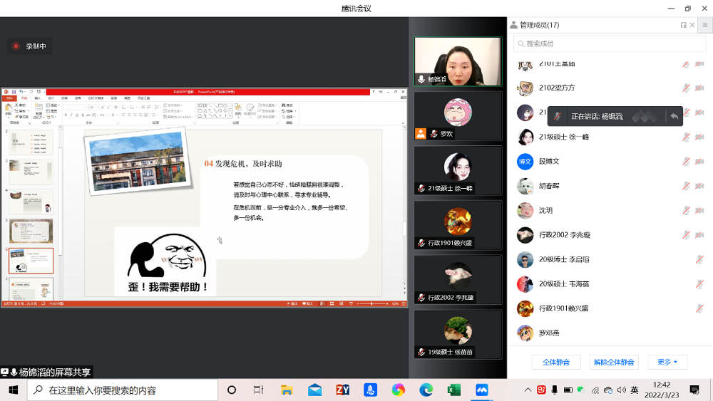 杨锦滔围绕“自我关爱,积极应对”等五个角度,传授给学生心理骨干如何开展工作,采取恰当方法疏解同学情绪,做到注重疫情防控与加强研究生、本科生心理教育相结合。