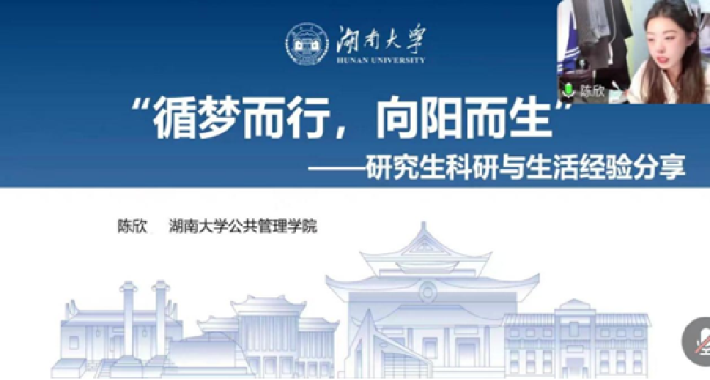 2022级硕士研究生陈欣以“循梦而行,向阳而生”为主题,就研究生科研与生活经验等内容进行了线上分享,第一会所