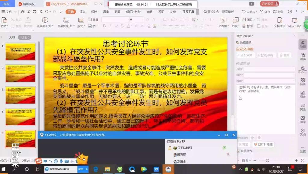支部首先围绕习近平总书记关于抗击疫情系列重要讲话开展学习研讨,认真领会党中央关于抗击疫情的重要指示精神。之后,支部就“在突发性公共安全事件发生时,如何发挥党支部战斗堡垒作用?如何发挥党员的先锋模范作用?”等问题展开讨论。郑朝阳指出:“战斗堡垒原是军事术语,具有防御和进攻功能,要发挥党支部的战斗堡垒作用就需要从攻和防两方面着力。‘防’主要指的是以保障人民群众安全为核心,‘攻’指的解决人民群众面临的实际困难。”支部其他成员分别从加强党支部建设、加强党群沟通、提高党员能力、遵守党纪党规等角度出发,针对如何发挥党支部的战斗堡垒作用以及如何发挥党员的先锋模范作用发表了各自的看法。