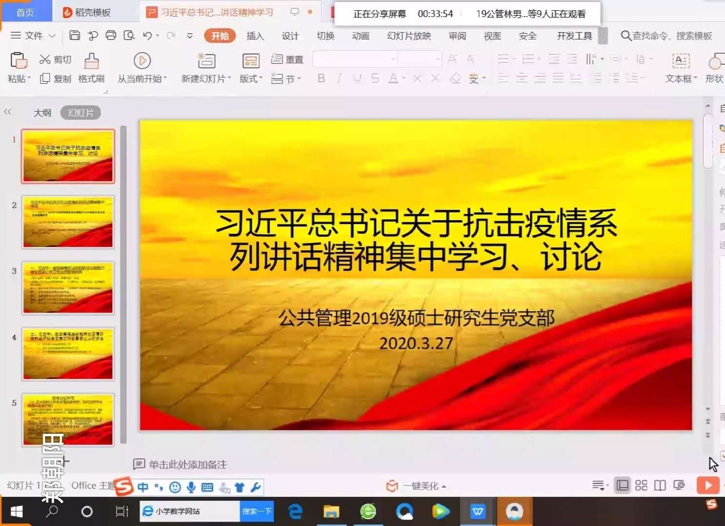 2019级硕士研究生党支部召开支部会议,集体学习习近平总书记关于抗击疫情系列重要讲话精神,本次会议由支部书记郑朝阳主持,支部全体成员参加学习。