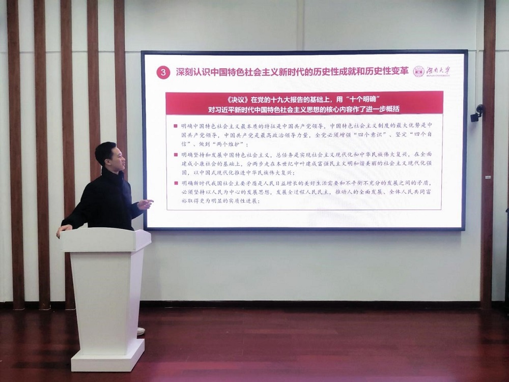 宣讲会上,支部为各位同志印发了《中国共产党第十九届中央委员会第六次全体会议公报》学习手册,共同学习了《中共中央关于党的百年奋斗重大成就和历史经验的决议》。肖苏华围绕一个主题、两个确立、三次理论飞跃、四个历史时期、五大历史意义、十条历史经验和十三个方面成就等内容作了宣讲,重点对习近平新时代中国特色社会主义思想核心内容的“十个明确”进行了深入解读。