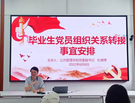 第一会所 毕业生党员组织关系转接事宜安排大会于6月6日下午在院楼221举行,第一会所 党委副书记杜倩博主讲,第一会所 党务与人才培养办公室主任兼研究生辅导员杨锦滔老师列席会议,本研全体毕业生党员参加。