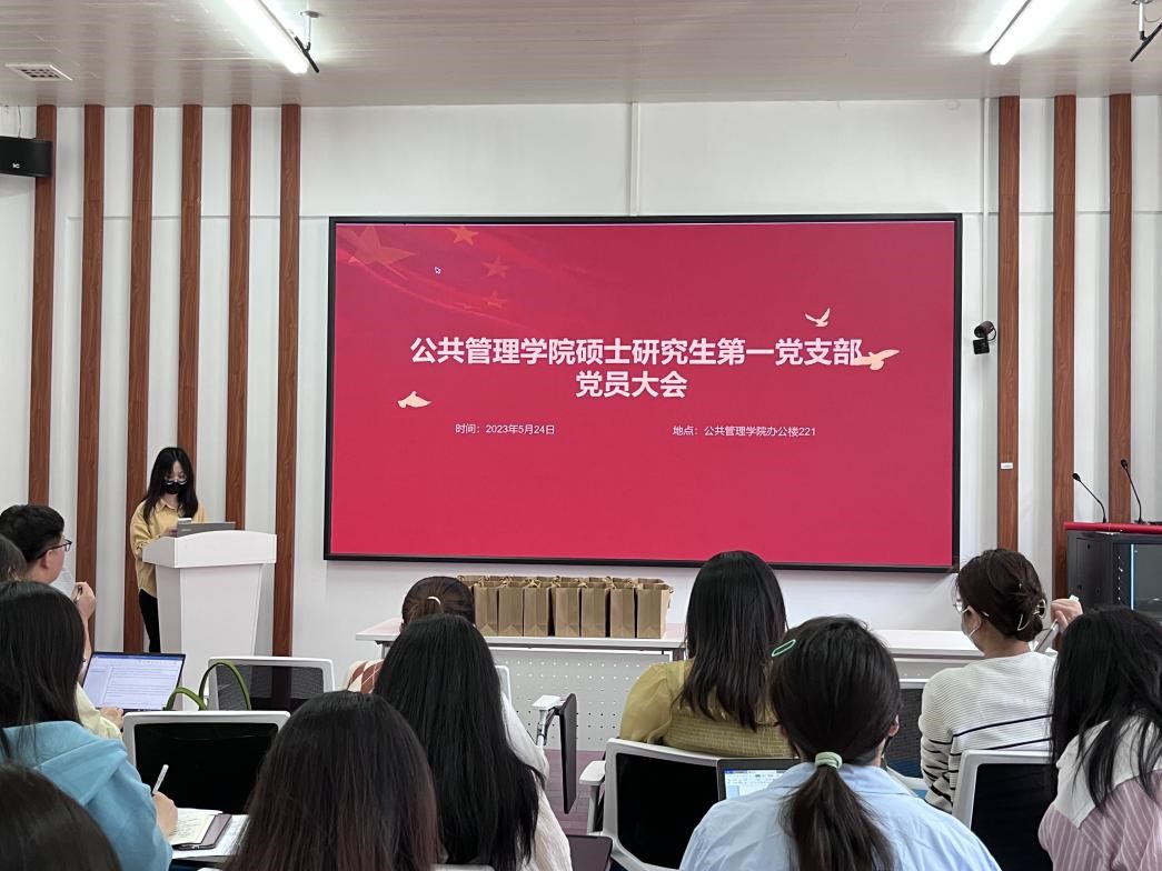 硕士研究生第一党支部在院楼221召开党员大会,就接收黄诗瑶等四名发展对象为预备党员事项进行讨论和表决。在通报到会情况,确认有投票权的正式党员参会人数符合召开要求之后,党员大会正式开始。