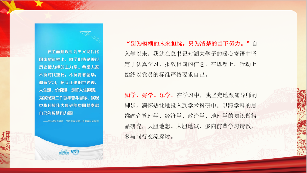 学子的暖心寄语中坚定了认真学习,报效祖国的信念,并在在思想上、行动上始终以党员的标准严格要求自己。接着,他从多和师友交流、跨学科知识积累、多参加学术会议和学科竞赛、如何开展合作和如何面对挫折等方面进行分享。他指出科研之路不可能是一帆风顺的,更多的是一波多折。但他始终坚信办法总比困难多,只要脚踏实地,勤于思考,不断总结经验、吸取教训,必然克服困难。
