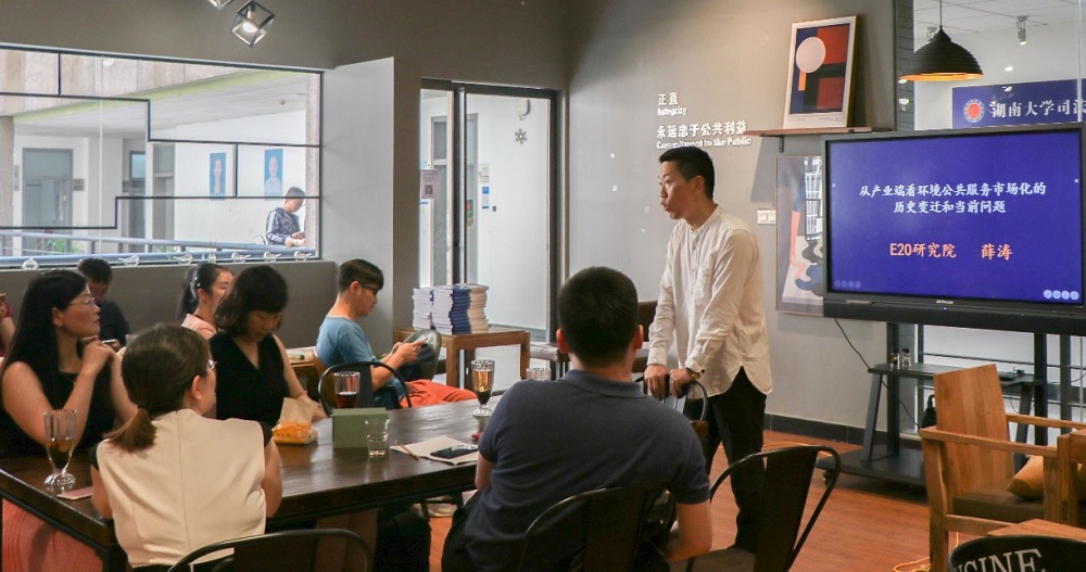 MPA学术午餐会在法学楼咖啡厅举行。本次会议交流的主题为“从产业端看环境公共服务市场化的历史变迁和社会问题”,由E20研究院执行院长薛涛做主题分享,左健教授主持,李连友院长、E20环境平台高级合伙人汤浩以及公管第一会所