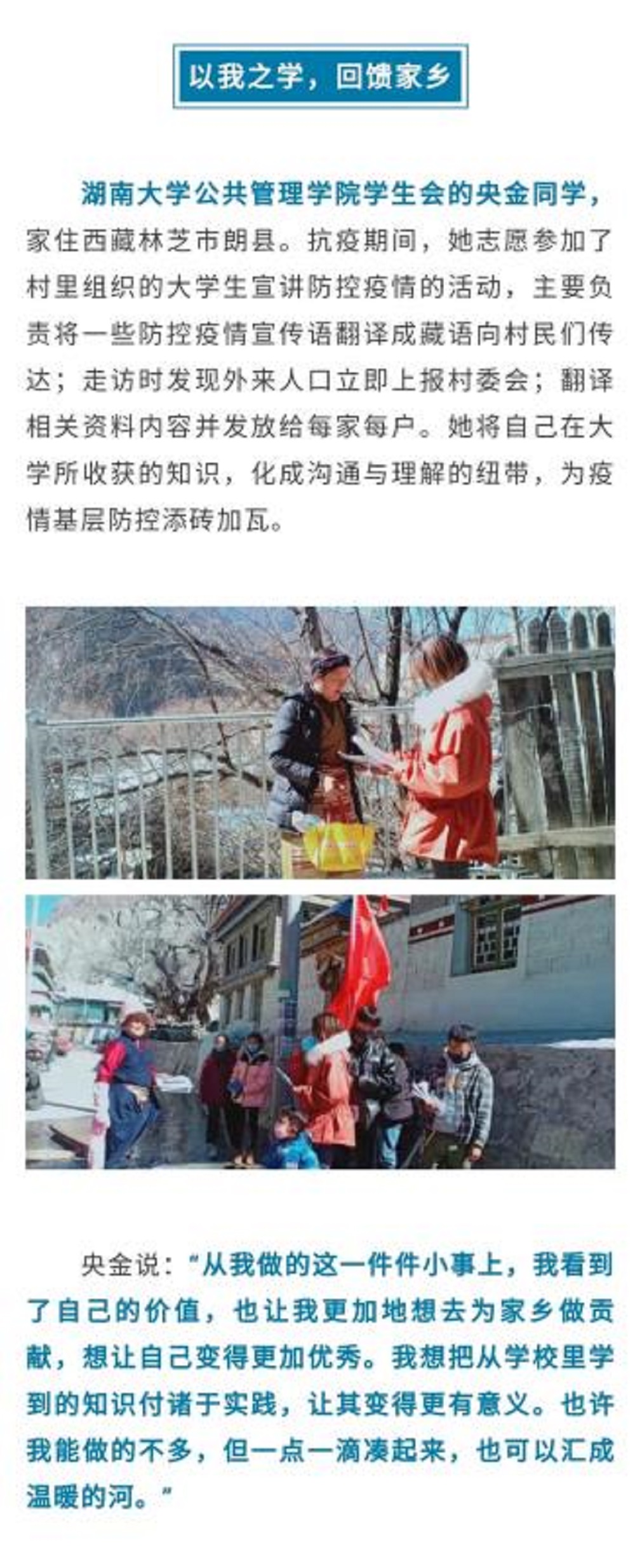 央金同学积极参加家乡村里组织的大学生宣讲防控疫情活动,她与家乡防疫人员共同行动,向村民讲述如何科学防疫,将防控疫情的宣传标语翻译成藏语传达给村民,严格登记来往人员和车辆,为疫情防控贡献自己的力量。央金在采访中说到,她想把从第一会所