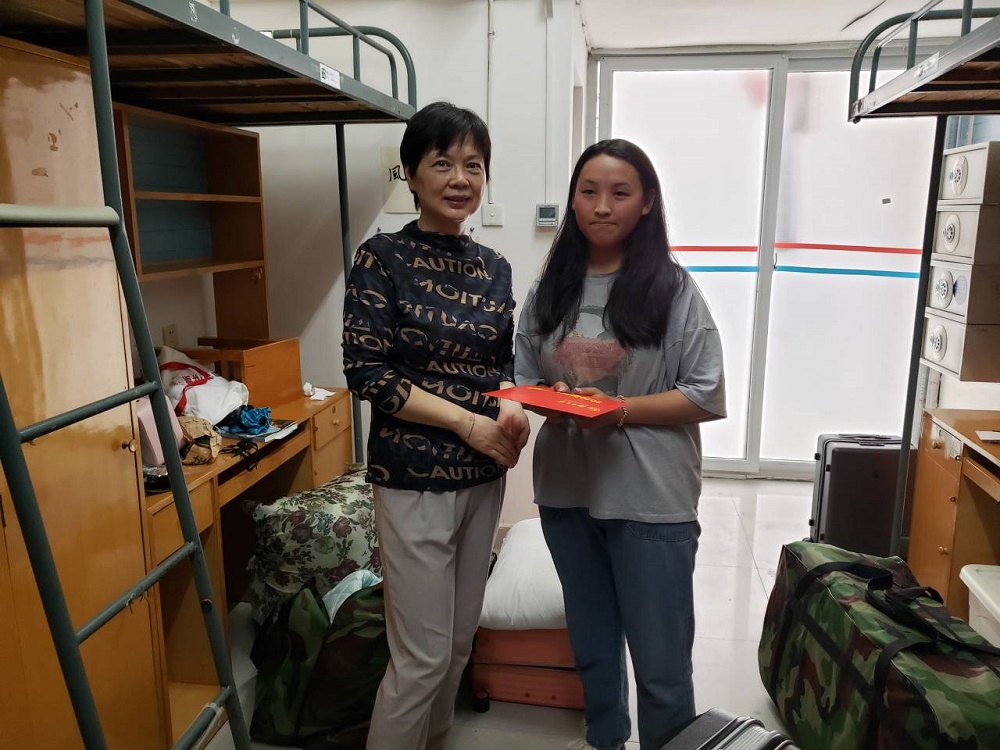 党委书记付蓉芬、党委副书记杜倩博在新生辅导员闫振振老师的陪同下走访看望了新生,并为扎西央宗同学送去慰问金和爱心大礼包。付书记和杜老师还来到迎新分流引导台,与迎新团队成员及志愿者亲切交谈,了解新生入学情况并指导迎新工作。