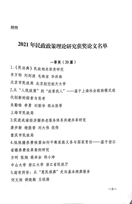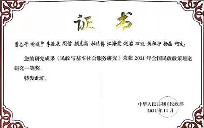 教师杨晶老师和江海霞副教授共同申报的研究成果《中国老年人健康及其不平等影响因素与积极老龄化政策优化研究》喜获2021年民政政策理论研究一等奖(全国仅39项)。