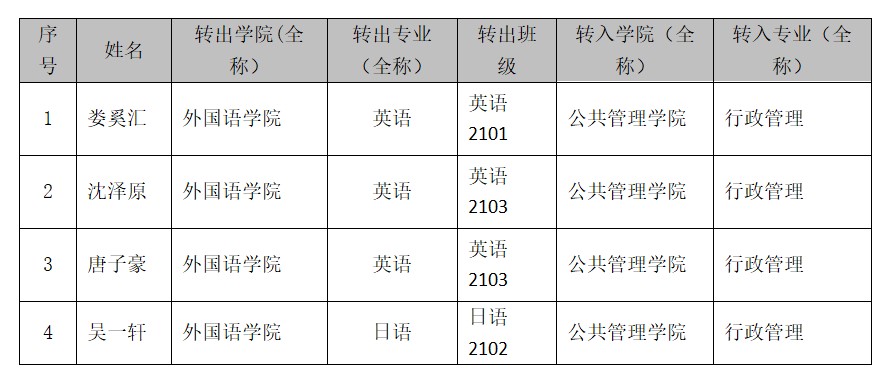 经过学生本人申请,转出第一会所 审核,转入第一会所 面试审核,以下4名学生转入行政管理专业申请审核通过,现予以公示,公示期三天。如有异议,请在公示期里实名据实向第一会所 反映。联系人:赵老师,联系电话88821399,邮箱[email protected]。