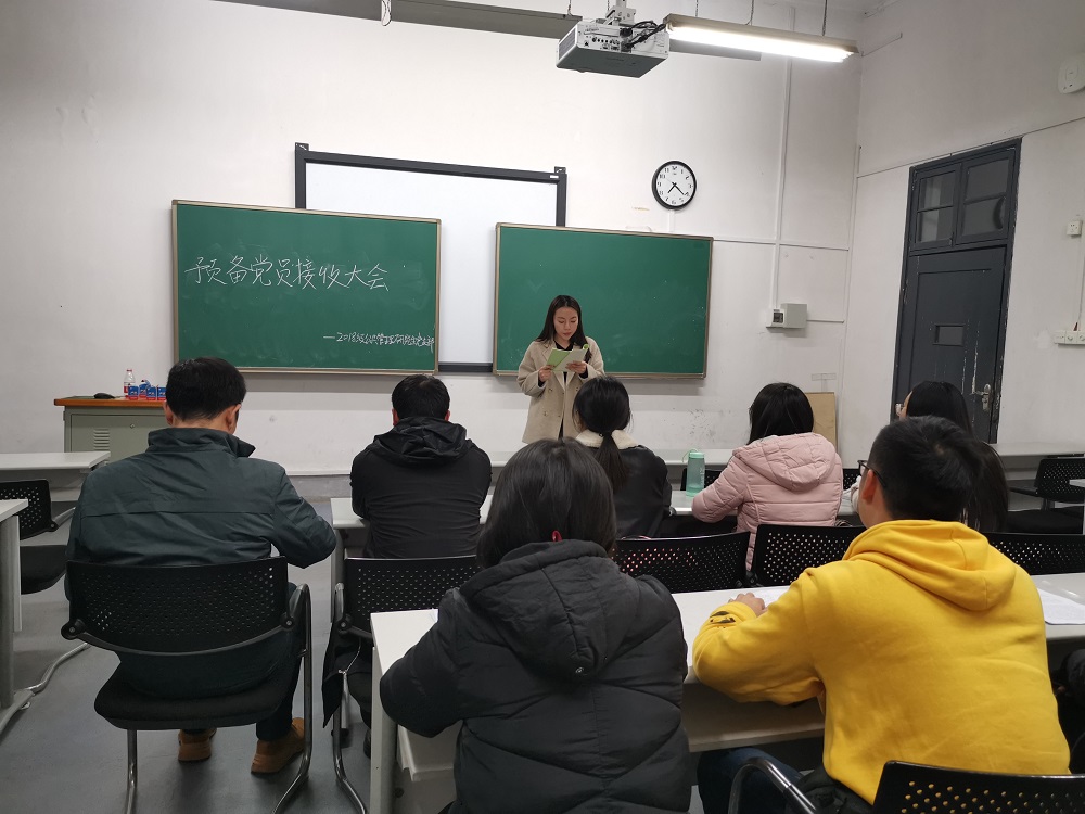 2019年11月28日晚,2018级公共管理党支部召开全体党员大会,讨论是否接收罗小江同志为中共预备党员。2018级公共管理研究生党支部应到会正式党员10名,实到正式党员9名,符合组织规定,大会有效。会议由支部组织委员孔心悦主持。