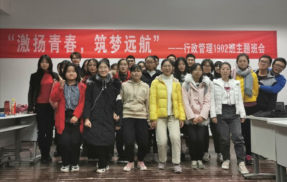 行政管理1902班举行“筑梦青春”主题班会。本次班会由行政管理1902班班委策划,班长李鹏程主持,2019级本科生辅导员闫振振老师、班主任程聪慧老师及全体同学参加班会。