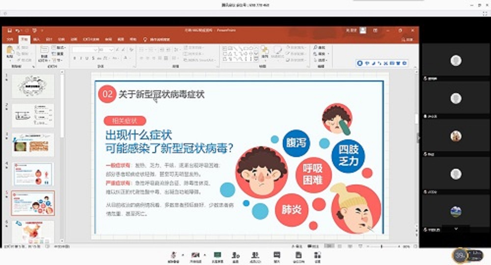班会伊始,刘昱呈同学首先从病毒介绍、传播途径、相关症状以及目前全国疫情发展状况和发展趋势做了简单的介绍,与同学们一起解了疫情的基本状况。随后的互动时间,同学积极探讨,谈疫情对自身的影响并为同学们提出实质性建议。裴文静同学向大家讲述了自己在家的生活:平时尽量不出门,在家劳逸结合,在休闲娱乐的同时,也不忘记要看看书。张滢丹同学则通过讲述自己在家乡的见闻提醒大家:为了自身的健康和安全,近期还是尽量少外出活动,等到情况稳定了,再出门活动也不迟。