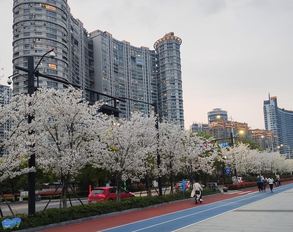 这是杭州滨江的“樱花大道”,初春季节是这里最美的时候。左侧樱花如雪,风过时,散落满地,右侧江水滔滔,碧蓝的水印着城市的倒影。这条樱花大道建成大概也有三四年了,这是我第一次在樱花盛开的时候路过这里,往常这个时候早就已经开学了。