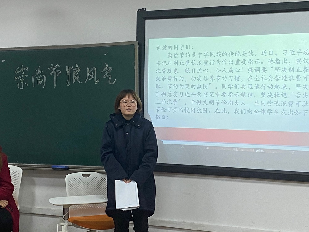 行政管理2002班于11月26日在综合楼308教室开展了以“崇尚节粮风气,厉行勤俭节约”为主题的班会。本次班会由班长方佳辉主持,行管2002班全体同学参加。