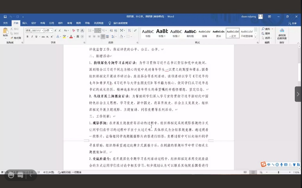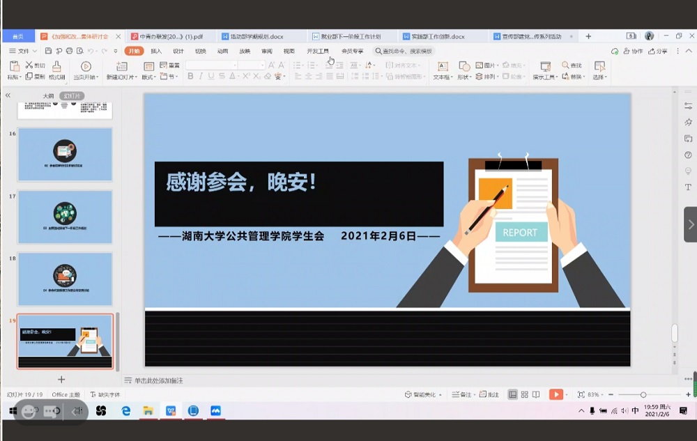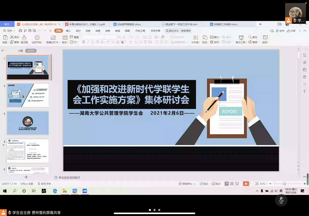 团委、学生会采用线上会议的形式开展《加强和改进新时代学联学生会工作实施方案》集体研讨会。此次会议由学生会主席费梓萱主持,团委、学生会主席团及各部门成员,年级会、班委会成员,国际关系协会、湖湘廉风学社学生代表参加。本次会议主要分为学习《加强和改进新时代学联学生会工作实施方案》文件精神和主席团成员做下一阶段工作规划两部分,旨在回顾本学期工作成果和不足,展望下学期工作规划,以提高各部门工作效率及业务能力。