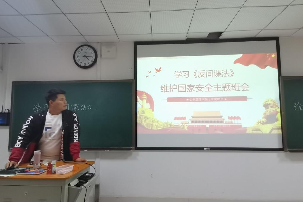 号召,在研究生楼A204教室开展主题班会,学习《反间谍法》相关文件。本次班会由行政2001班班长王麒隆主持,行政管理2001班全体同学参与。