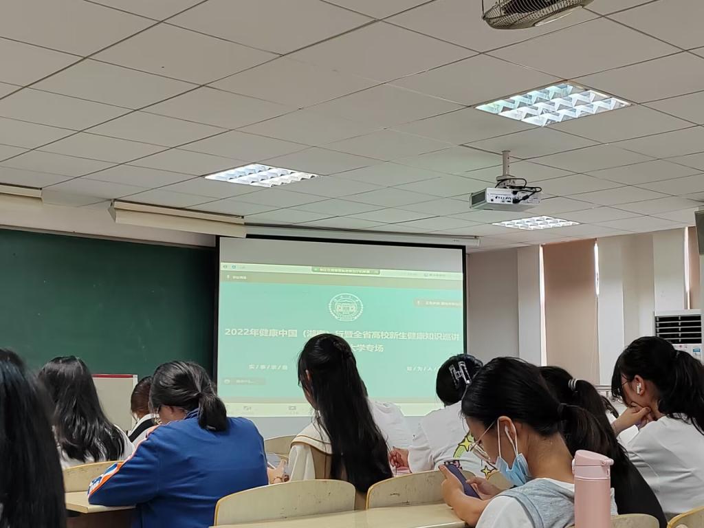 全体新生集中在综合楼506教室参加由湖南省疾控中心副主任陈曦老师主讲的线上讲座—2022年健康中国(湖南)行暨全省高校新生健康知识巡讲(第一会所
